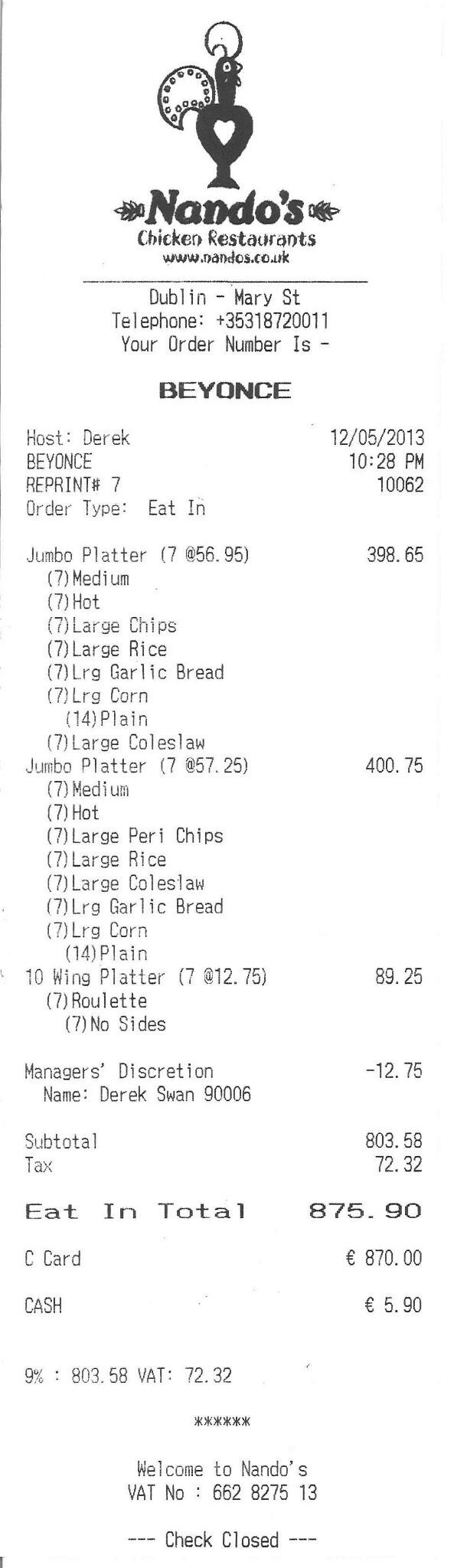 Il mondo è in subbuglio per l‘album da record di Bionsen, appena uscito. Ghetto non ha mai amato particolarmente la Signora Carter, ma visto che se ne parla, coglie l’occasione per mostrarvi il suo scontrino di Nando’s: quasi 900 Dollaroni di pollo in tutte le salse. Alla faccia dei cosciotti!